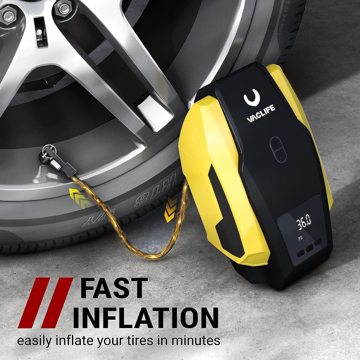- [AUTO SHUT OFF] Simplicity meets functionality. VacLife car air pump provides you with rest-assured using experience based on the auto-shut off function. Preset the desired pressure level and start inflating job. The car air compressor will shut off automatically at the desired level. There is no need to worry about over inflating, VacLife smart inflator for tires got your back.
